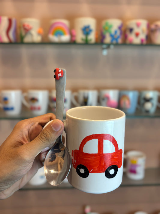 Hand-Painted Ceramic Car Mug with Matching Handmade Spoon – Unique Gift for Car Lovers